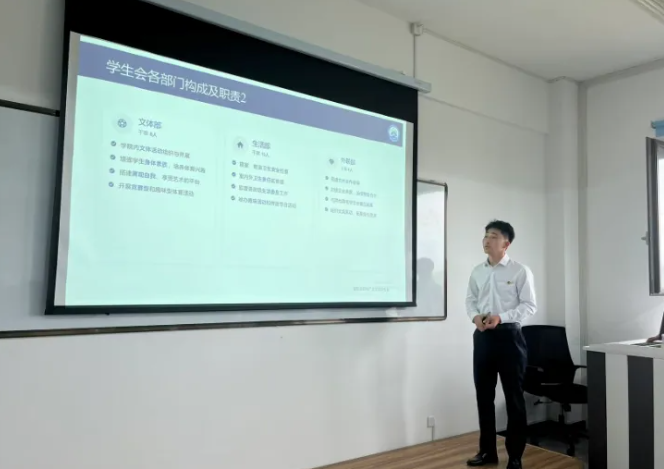 随后,活动由主席团主席袁朝琳主持,他围绕学生会各部门的职能定位、工作亮点及发展前景展开详细介绍。从负责统筹协调的主席团,到聚焦校园生活服务的生活部、助力校园文化建设的文体部等,袁朝琳主席用清晰的讲解和鲜活的案例,让新生们对各个部门的工作内容有了直观认知。同时,他还针对纳新流程、报名要求、考核标准等新生关心的核心问题进行了全面说明,确保每位有意向的同学都能清晰了解报名细则。